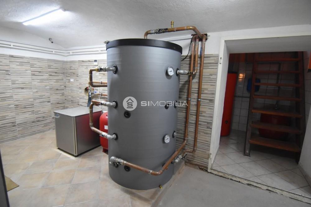 The boiler room has installations for a heat pump and a new storage tank for domestic hot water heating.