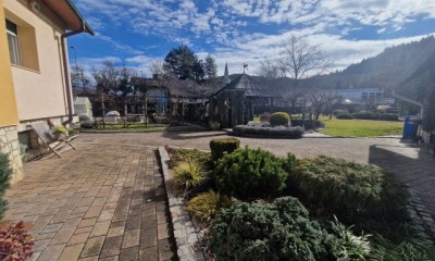 Pred objektom je tlakovano parkirišče, pomožni objekt - garaža ter pavilijon za druženje.