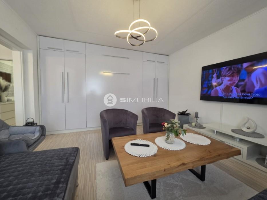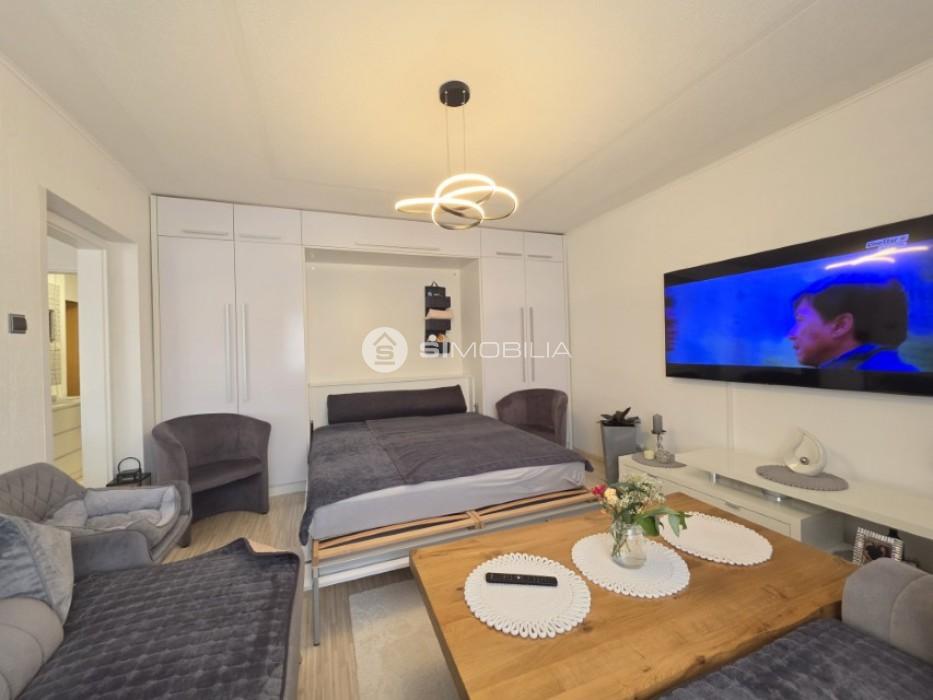 Posebnost stanovanja je vgradna postelja v dnevni sobi, ki je podnevi skrita v omari, ponoči pa omogoča udobno spanje.