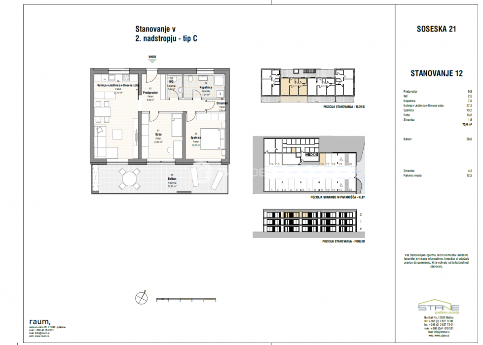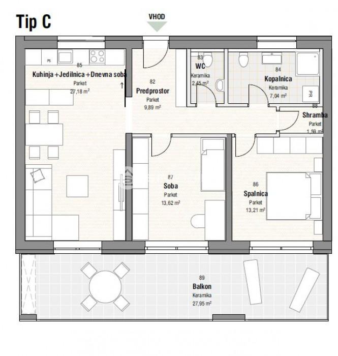 Enota C predstavlja 3-sobno stanovanje neto tlorisne površine 75 m2 z balkonom v izmeri 30 m2 ter shrambo v kleti v izmeri 4 m2 in dvema parkirnima mestoma.