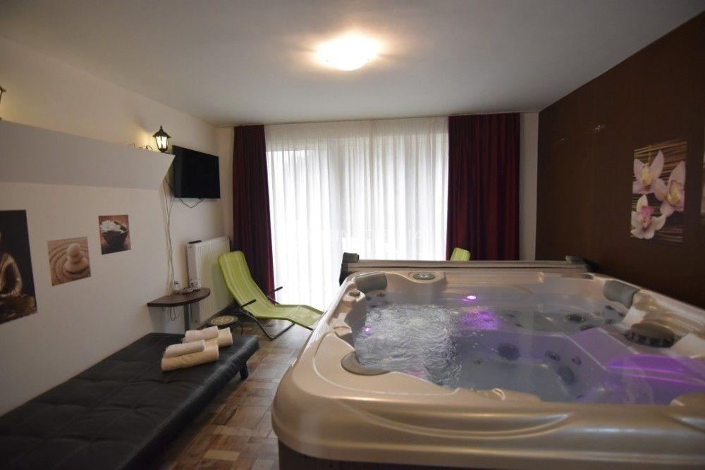 The other building, the hotel with wellness was renovated in 2012. The building has 4 floors, measuring 523 m2. It consists of 13 comfortable apartments with private bathrooms. They come in the size of 16.2 m2 to 44.5 m2. All apartments are equipped with a TV and writing desks. Some have exits to the balcony. In the basement, there is bright wellness with exit to the green yard. The room includes a jacuzzi, a bathroom, and a Finnish sauna. It offers a lot of privacy.