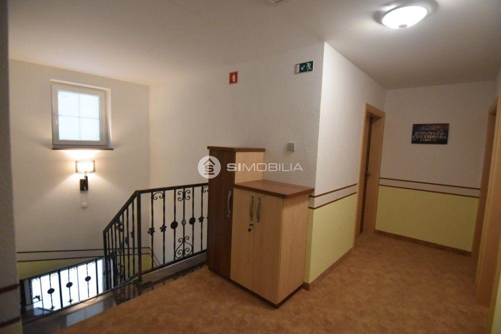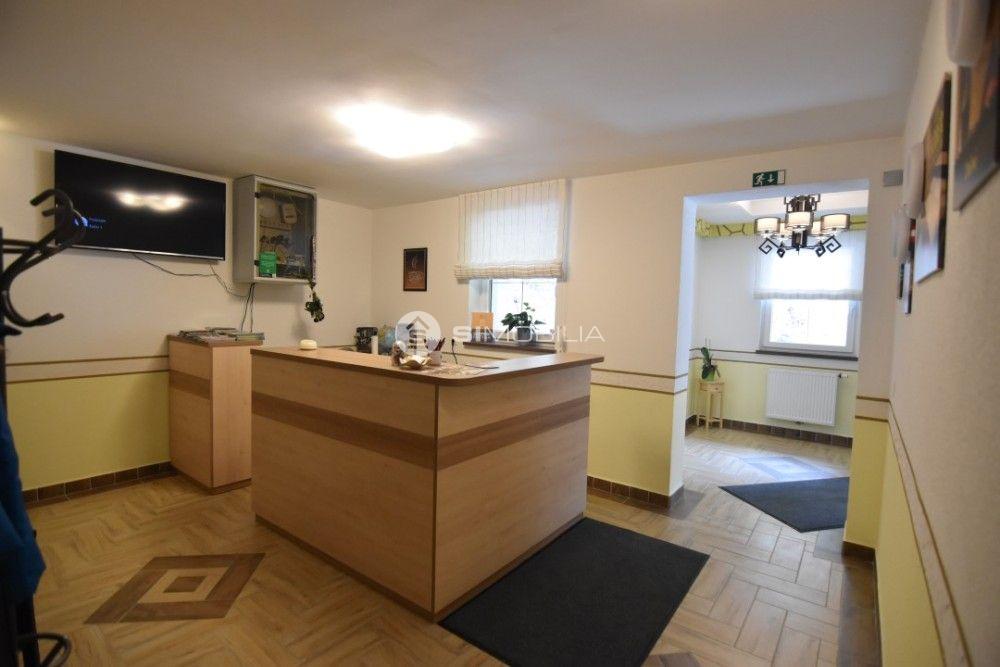 The building with a guesthouse is in 4 floors on 805,7 m2. The guesthouse was completely renovated in 2004 and in addition to the catering facilities also includes a residential part. The catering part is on 264,50 m2, where there is a hall that accommodates up to 80 people, bar and additional room for about 20 people. On the same floor, there are sanitary facilities, separately for men and women. The entrance to the guesthouse is decorated with a stone staircase and a terrace with a fireplace, partly covered with a roof. The residential part is located on the first floor and mansard. It consists of equipped three 3-room apartments of floor area from 80,8 m2 to 126 m2. There are also smaller accommodation units with bathrooms in the size of 13,6 m2 to 19,7 m2, also equipped with a kitchen. There is a large parking lot in front of the building in the size of approx. 1000 m2 for about 40 parking spaces. The complex is easily accessible. The guesthouse is heated on wooden chips. The facility has its own water catchment. The sanitary water heats the heat pump.