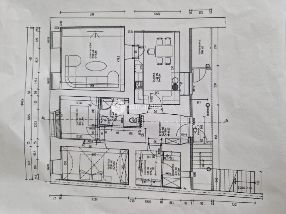 Obsega 3 sobe (spalnica, otroška soba, dnevna soba), kuhinjo, kopalnico, predprostor in shrambo.