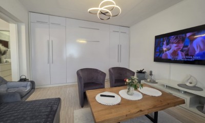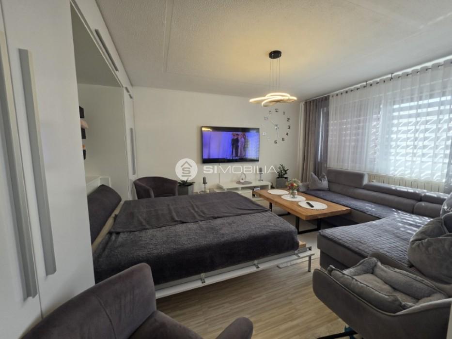 Posebnost stanovanja je vgradna postelja v dnevni sobi, ki je podnevi skrita v omari, ponoči pa omogoča udobno spanje.