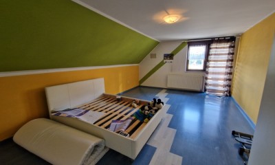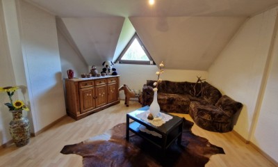 Nadstropje: predprostor s krušno pečjo, dnevno-bivalni prostori s kuhinjo, 2 sobi in kopalnica