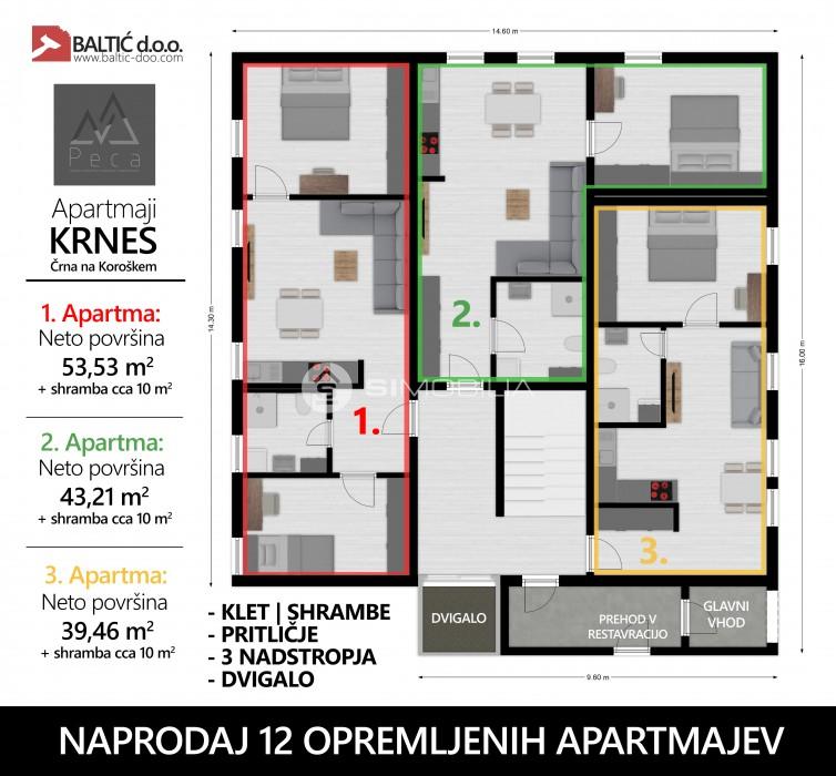 Urejenih bo 12 opremljenih apartmajev, neto površine od 39,46 m2 do 53,53 m2. Vsakemu stanovanju pripada v kletni etaži shramba v izmeri cca 10 m2.