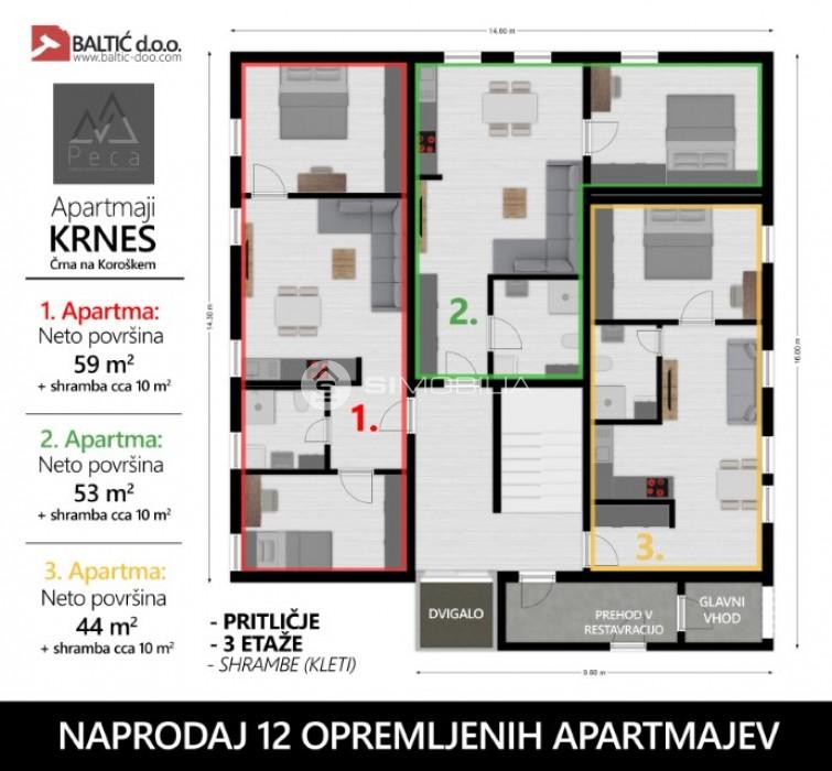 Predstavljamo vam 2-sobni apartma v skupni izmeri 67,8 m2, od tega bivalna površina 53,3 m2 in klet v izmeri 14,5 m2. Nahaja se v 2.nadstropju turističnega objekta APARTMAJI KRNES v centru Črne na Koroškem.